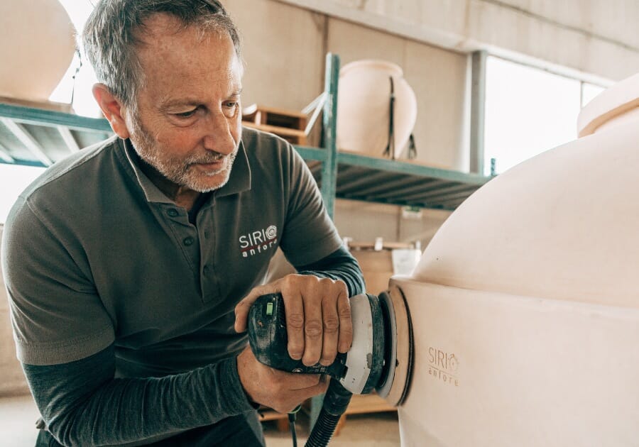 Le mélange d'argile est soigneusement travaillé à la main dans des moules en gypse pour donner une forme à l'amphore. Dès que le moule est désarmé, un lissage de la superficie interne et externe est effectué pour faciliter le lavage après la vinification et pour sceller la surface. Tout est strictement fabriqué à la main.